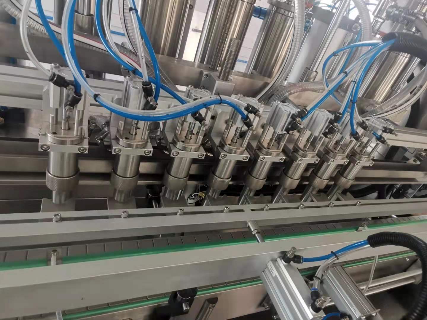 多头活塞式全自动灌装机是我司集多年生产经验,吸收先进技术自行研制开发的新一代自动灌装机。它采用活塞式定量原理,电器和气动元件选用世界知名品牌,由PLC配合人机界面控制,设计新颖、